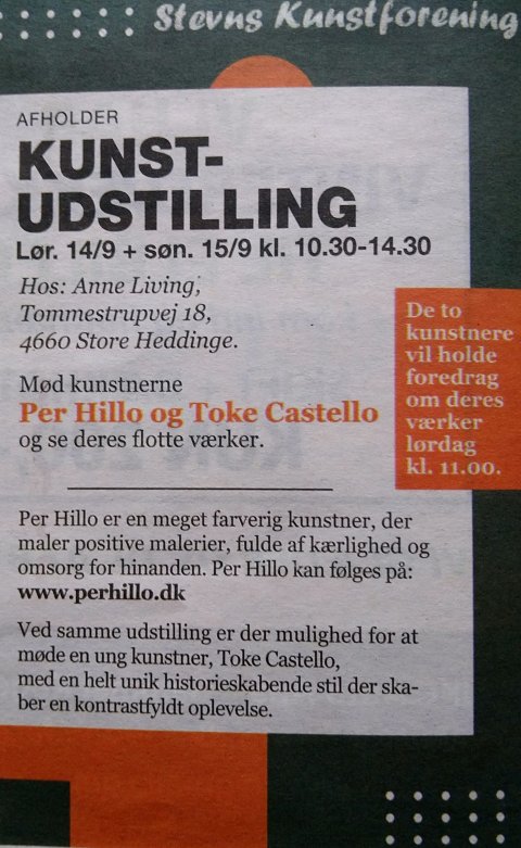14. & 15. september, kunstudstilling af Per Hillo, en meget farverig kunstner, som krydre udstillingen med et foredrag.